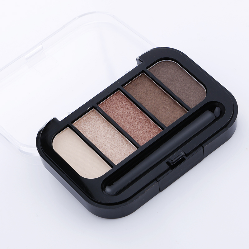Eye shadow palette dimension is 77.5x50x14.5mm. clear lid with logo,black base,with a double ended brush.